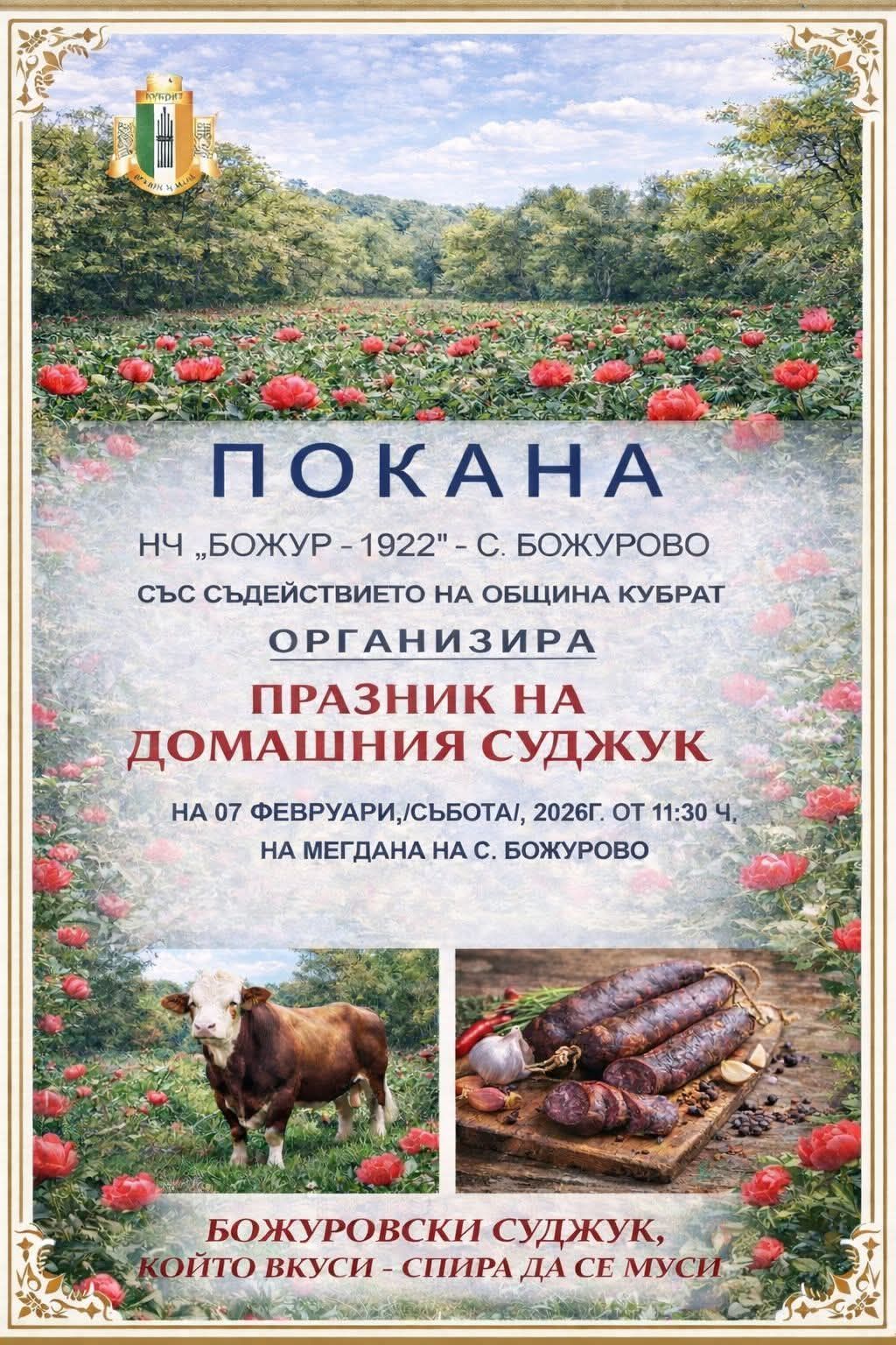Народно читалище „Божур – 1922“ в село Божурово, със съдействието на Община Кубрат, организира Празник на домашния суджук, който ще се състои на 7 февруари (събота) 2026 г. от 11:30 часа на мегдана в селото.