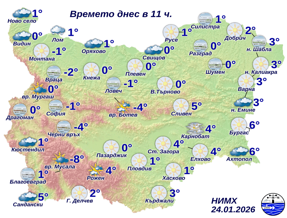Днес в по-голямата част на Разградска област ще е мъгливо. След обяд на места видимостта временно ще се подобри, но ще остане с ниска облачност, а към вечерта отново ще се образуват мъгли. На отделни места ще преръми. Ще е почти тихо. Максималните температури ще бъдат между 1° и 6°, по Черноморието – до 9°, в София – около 4°.