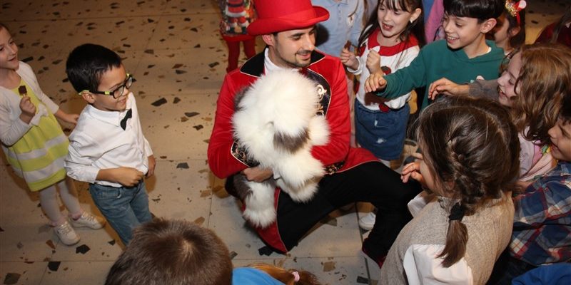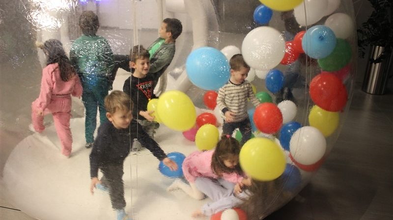 За най-малките участници в детското коледно парти имаше и огромна прозрачна сфера с летящи в нея цветни балони.