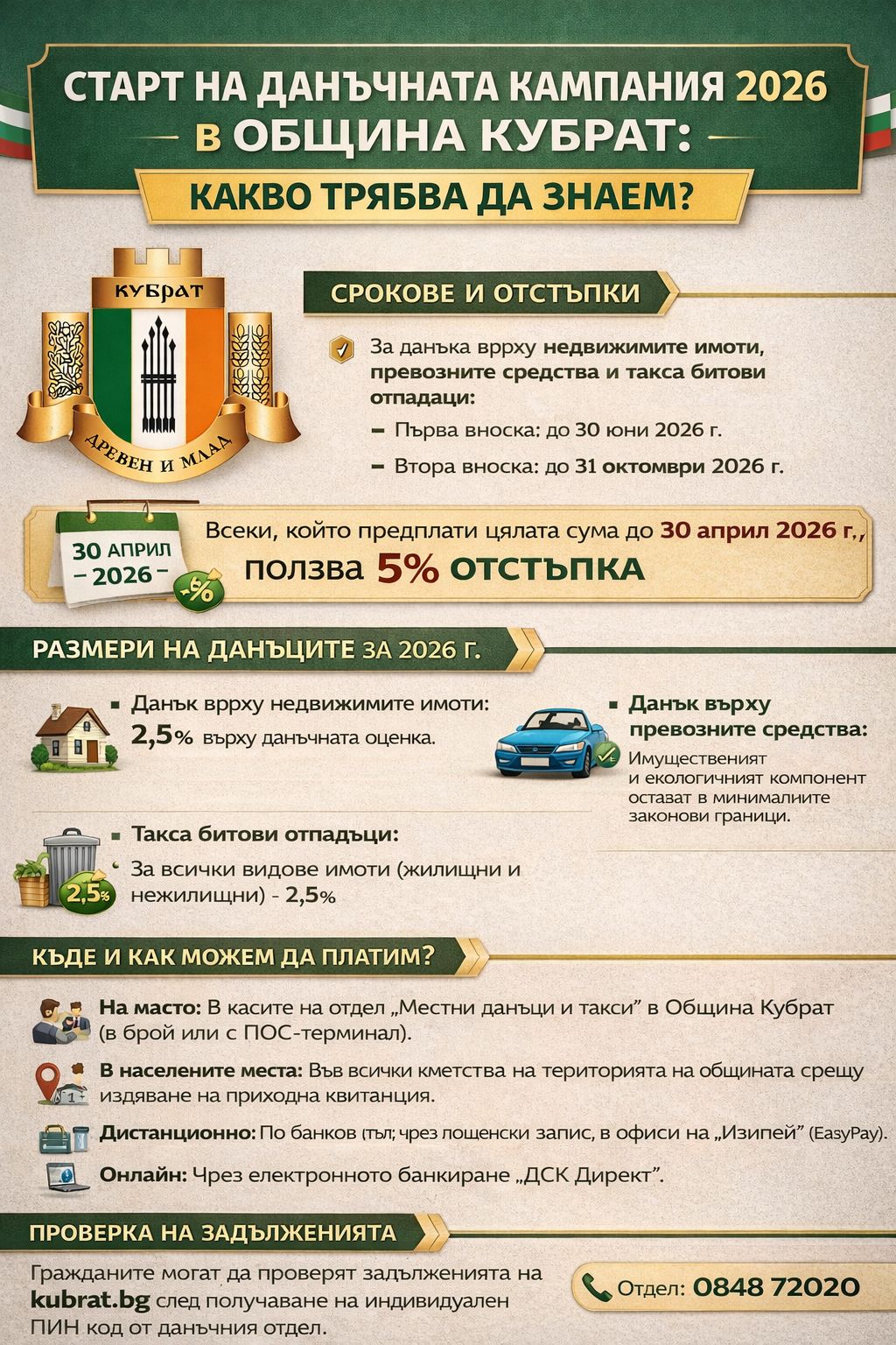 Започна кампанията по събиране на местните данъци и такси за 2026 г. в община Кубрат. Плащането се извършва съгласно разпоредбите на Закона за местните данъци и такси, като част от задълженията могат да бъдат внесени на две равни вноски – първата със срок до 30 юни, а втората до 31 октомври.