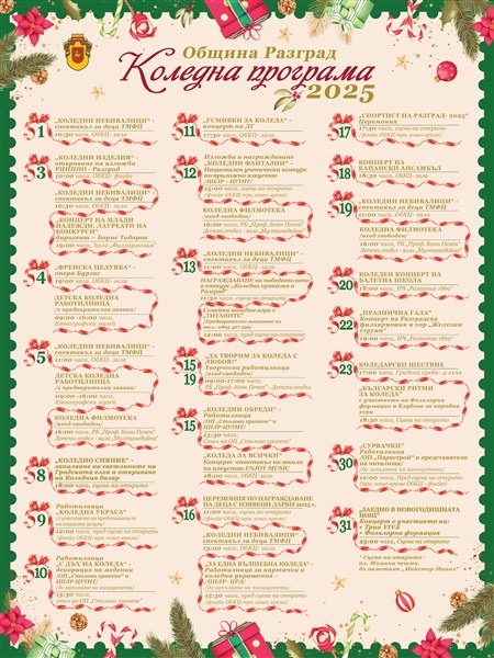 През декември по традиция ще има коледни концерти на: Разградската филхармония, Капанския ансамбъл, Спектакъл за деца на Театрално-музикалния център и други. И тази година ще има концерт с кауза на възпитаниците на детските градини. Събраните средства ще са в подкрепа на кампания „Аз вярвам и помагам“, която е за закупуване на детски линейки.
