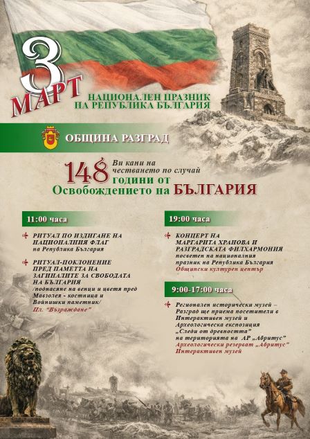 С ритуал по издигане на националния флаг на Република България ще започне в Разград отбелязването на Националния празник Трети март и честването на 148 години от Освобождението на България. Общоградското събитие ще се проведе на площад „Възраждане“ с начален час 11,00 ч. на 3 март, вторник. Акапелно изпълнение на Химна на Република България от възпитаници на Музикална школа „Илия Бърнев“ към НЧ“Развитие 1869“ и тържествено слово на Кмета на Община Разград Добрин Добрев включва още програмата за Трети март. В нея ще участва и Градският духов оркестър.