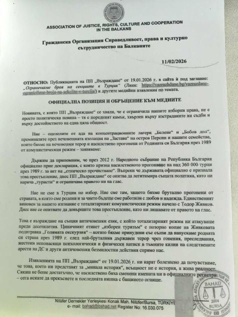 35 изселнически организации от Турция са подкрепили официалната позиция на гражданска организация „Справедливост , права и културно сътрудничество на Балканите “ /БАХАТ/ в гр. Бурса , с председател г-жа Сафие Юрдакул от разградското село Киченица , срещу опита на партия „Възраждане“ за изборна дискриминация и ограничаване на конституционни права. Позицията е подкрепена и с Декларация за обща подкрепа, подписана от 35 дружества – изселнически граждански организации в Република Турция, чиито членове са няколко хиляди български граждани със същите конституционни права като сънародниците ни в Република България. В документа до медиите се казва: ,, Молим за Вашето внимание и даване на гласност на нашата позиция, приета по повод гласуваното в 51-то Народно събрание предложение на политическа партия „Възраждане“ за ограничаване на изборните секции извън ЕС, което засяга страни като САЩ, Великобритания, Турция, Швейцария и др., в които живеят по-голям брой български гласоподаватели. За нас това не е просто „административна мярка“, а е грубо нарушение на конституционните права на хиляди български граждани, опит за нова репресия срещу общност, която вече е преживяла „етническото прочистване“ в периода 1984-1989 г., както и дискриминационно разделяне на гражданите на „хора в Европейския съюз“ и „втора ръка хора извън Европейския съюз“. Подписалите се в подкрепа на позицията организации и конфедерации са – Конфедерация на балканските и румелийските Турци , Федерация на балканските сдружения – Измир ,Федерация на Турците в чужбина и родствените общности , Балканска федерация – Анкара, РУБАФЕД – Федерация на румелийските и балканските сдружения , Федерация на румелийските сдружения – Черноморие. Следват имената още на 26 сдружения и граждански организации , в които членуват български изселници от Лудогорието и Кърджали.